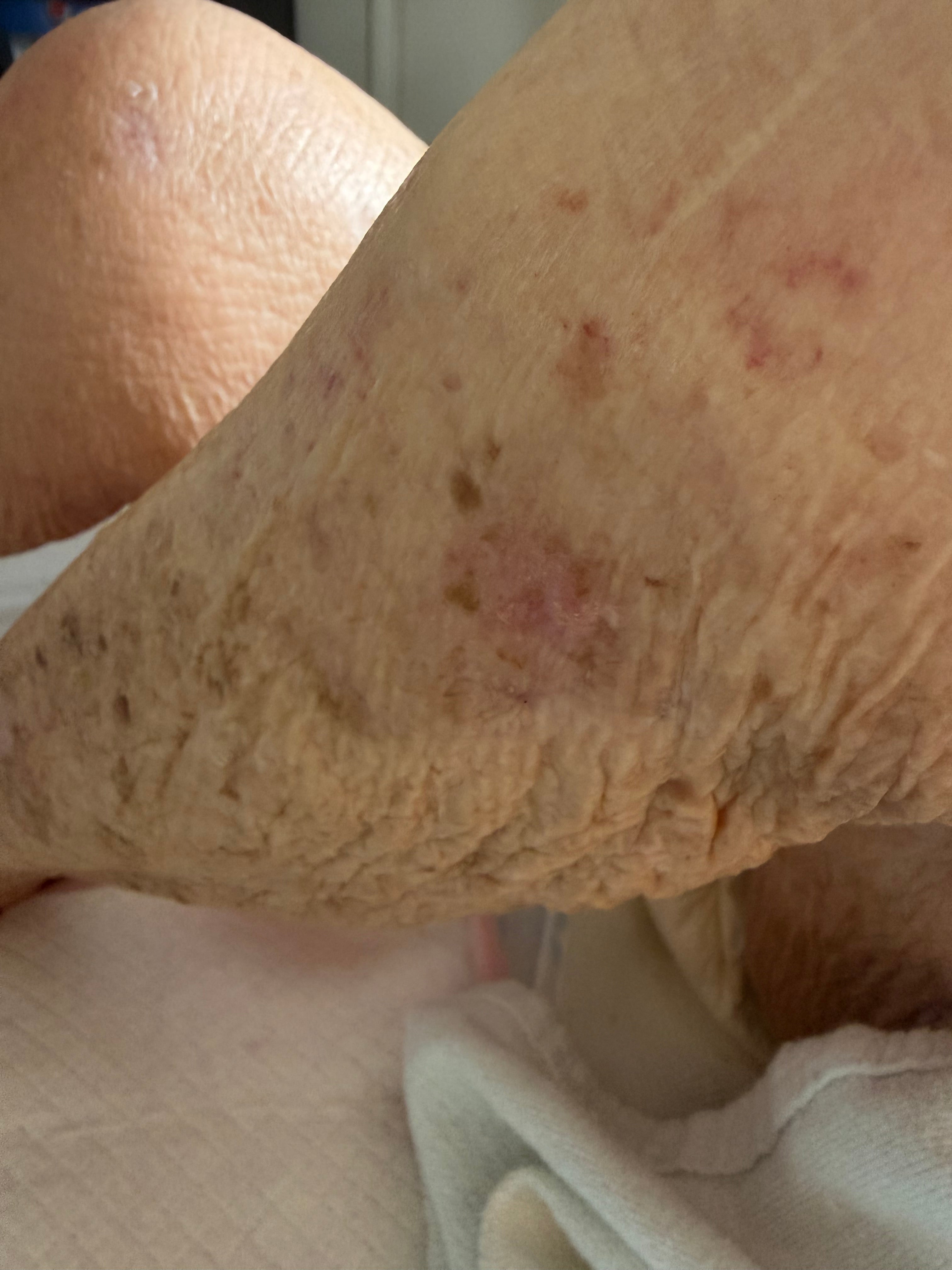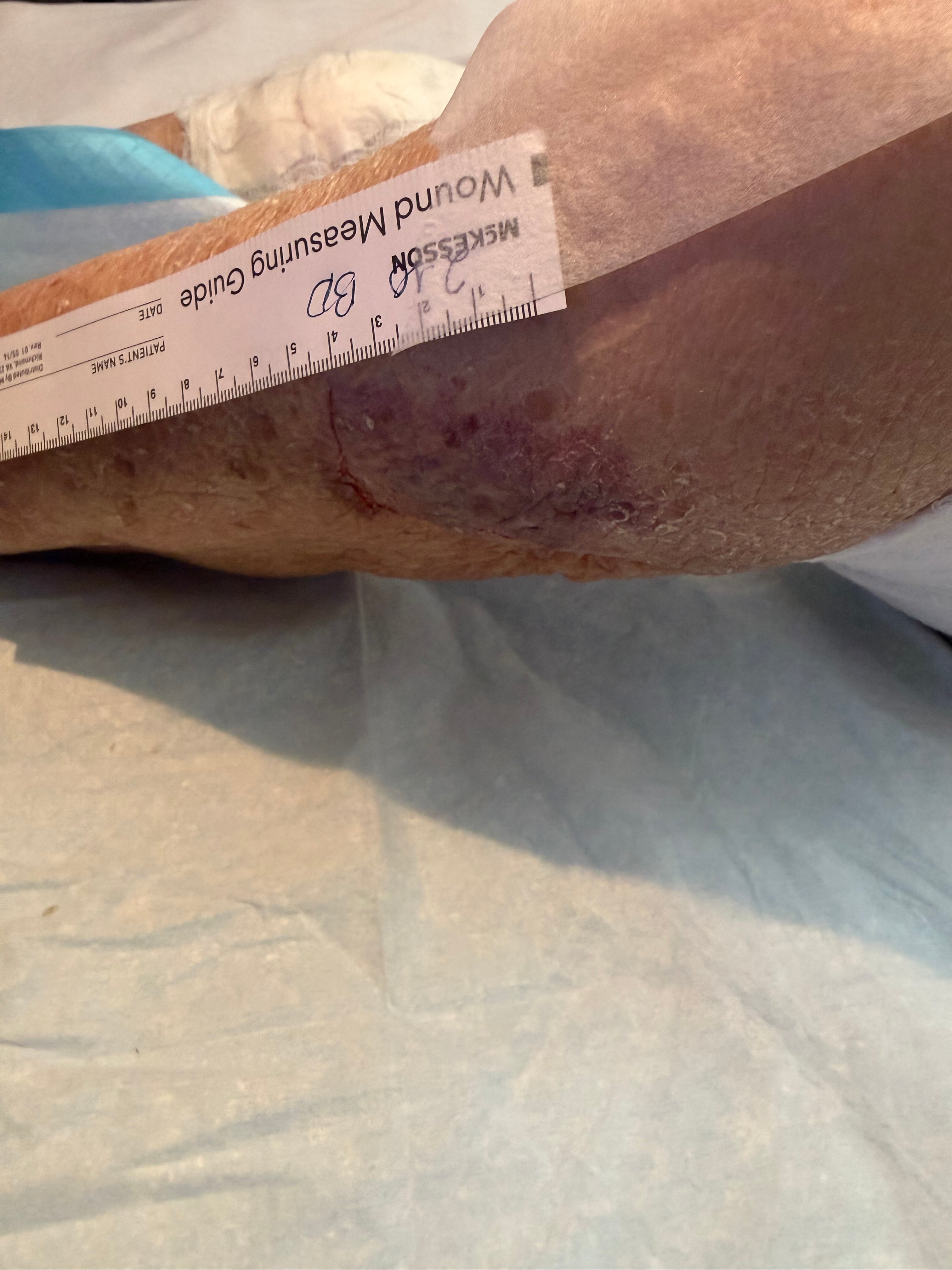 Wound has healed after weekly wound care for 8 weeks. Hyperpigmentation of the skin is common in these types of wounds.