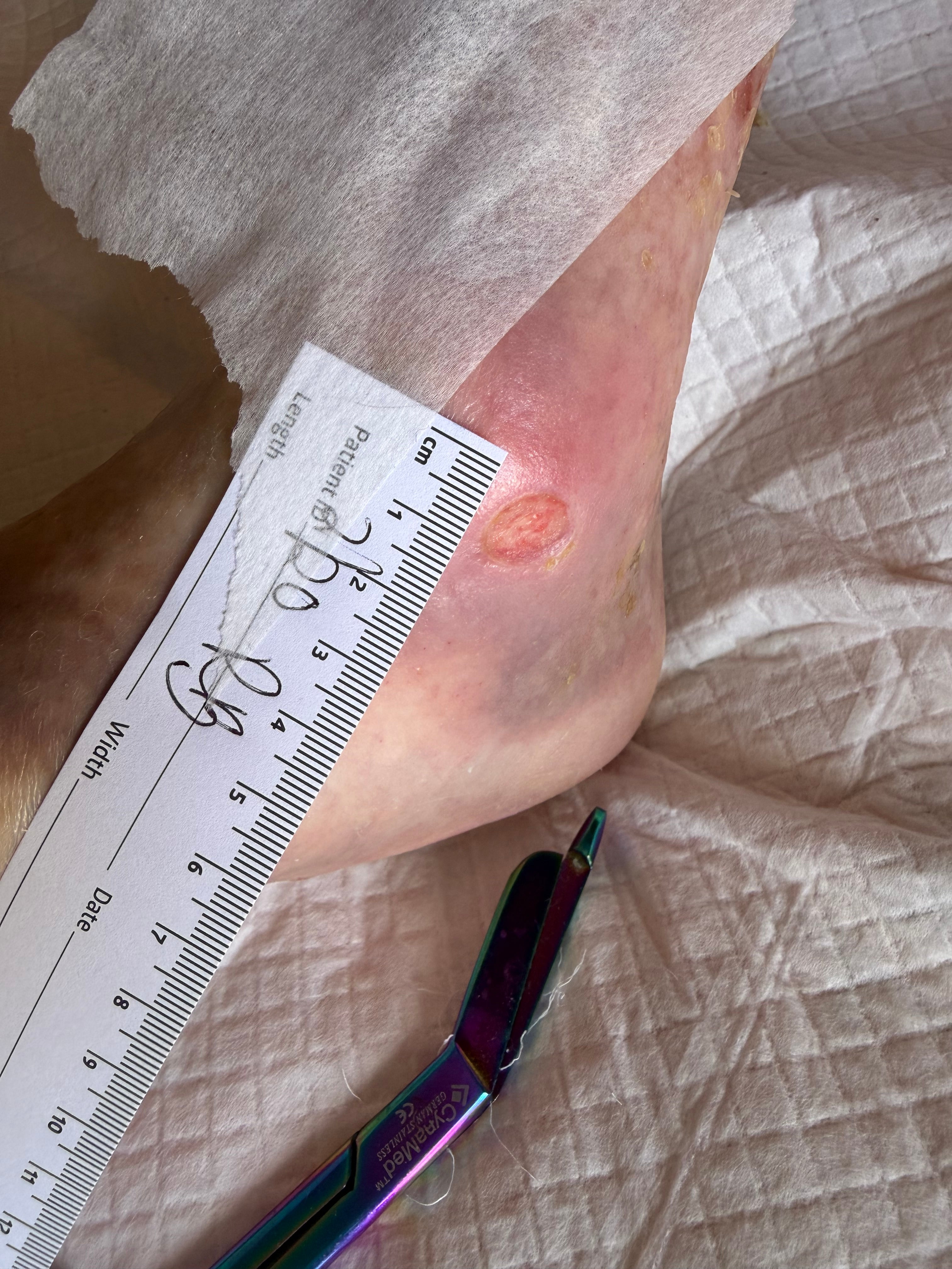 Resolution of pressure ulcer after 3 months of appropriate treatment and offloading heels.