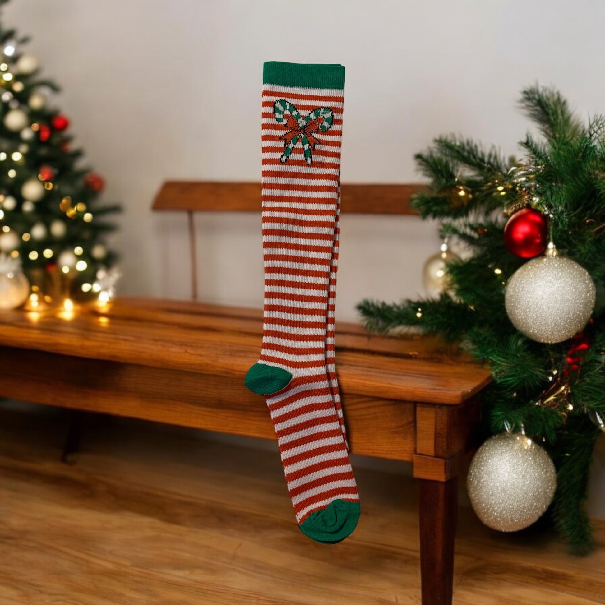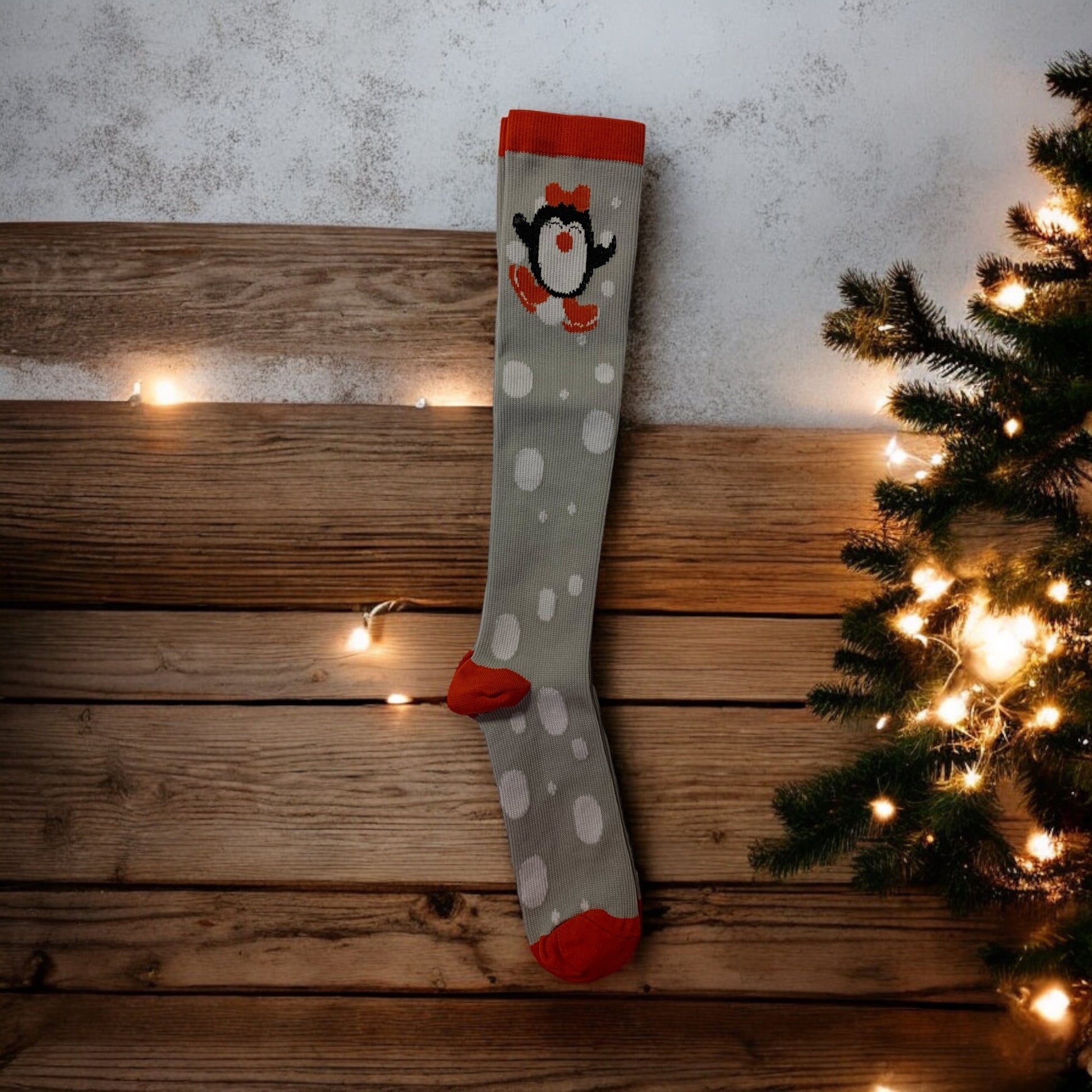 Christmas Light Below the Knee Compression Stockings, variety. Light compression is 15-20 mmHg. Size is L/XL. Will fit most people.